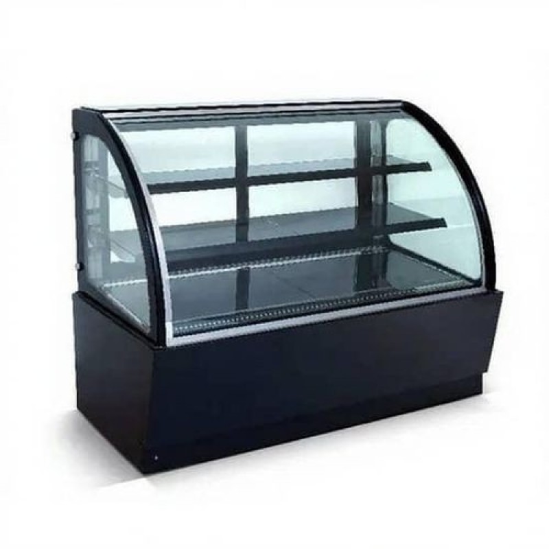 Rear sliding door, front curved glass, and black exterior for an attractive bakery display case