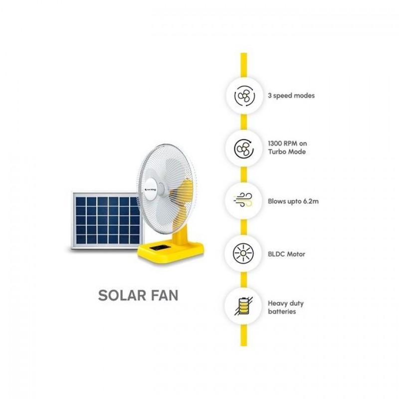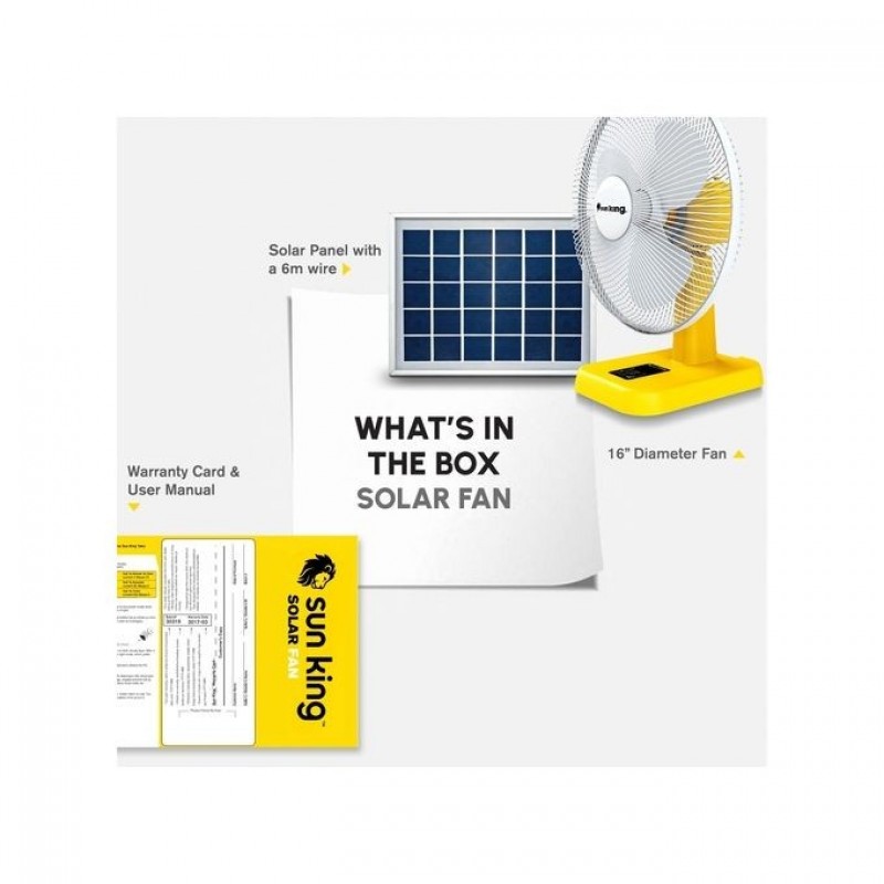 Greenlight Planet's latest product, the Sun King Fan strikes the perfect balance between performance, durability and affordability. It is designed to meet the basic cooling needs of under-electrified households around the world. The Sun King Fan has 16-inch blades which provide a powerful airflow with three Fan speed modes. It oscillates up to 90 degrees and features a built-in battery that charges directly from a 20W solar panel. The Sun King Fan has a powerful brushless motor, creating a uniquely quiet, user-friendly and flexible design.