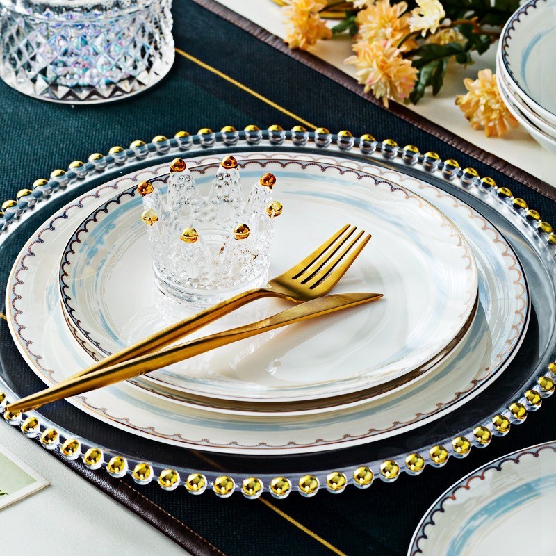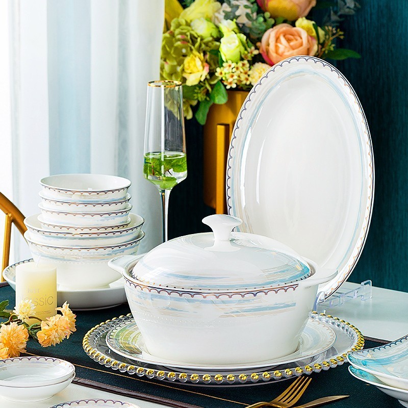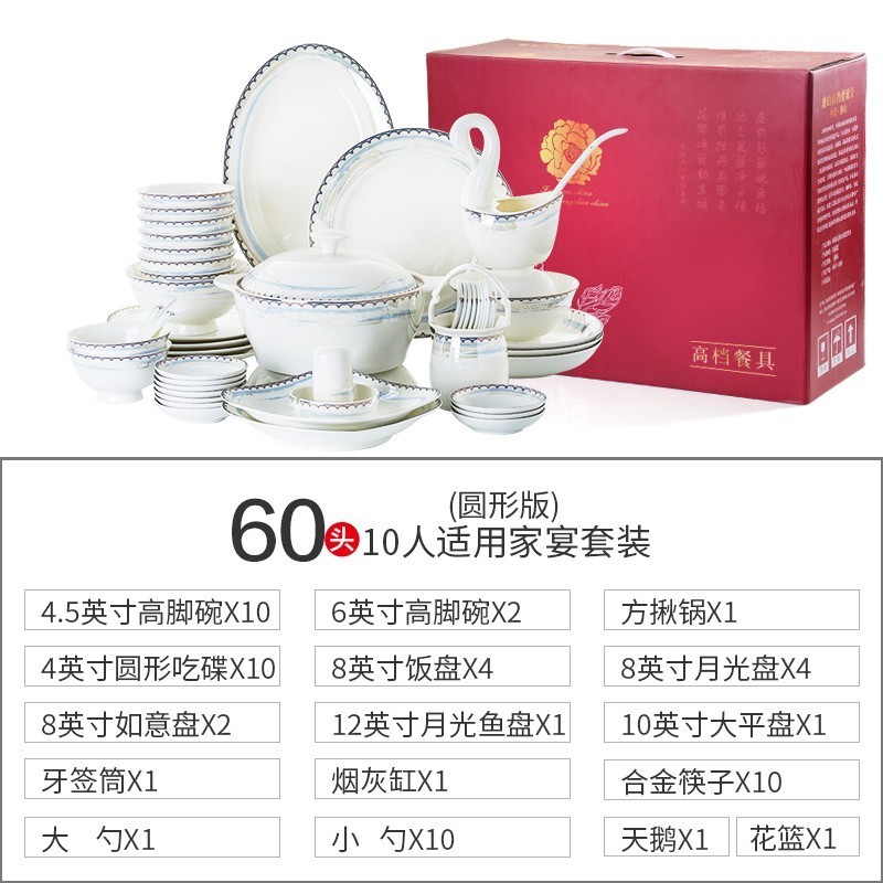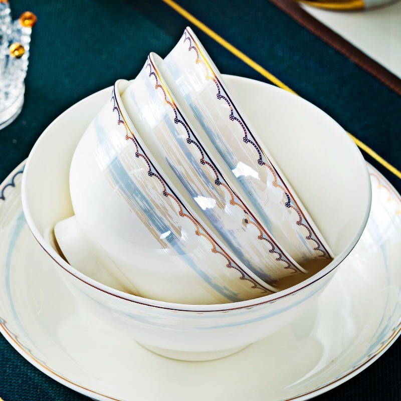 陶瓷餐具套装欧式碗碟套装家用碗筷金边盘子碗具温纹雅蜜60头(方揪锅)礼盒包装