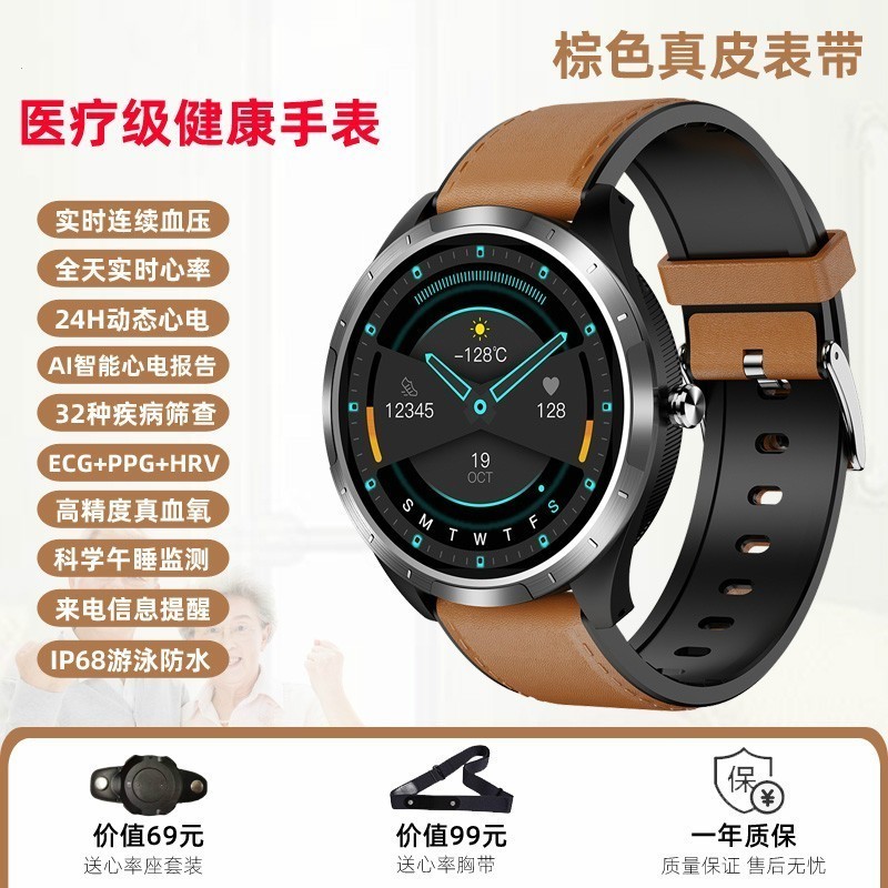 高精度医疗级智能手表实时血压检监测心率报警运动手环血氧心电图房颤早博睡眠远程健康男女老人监护仪