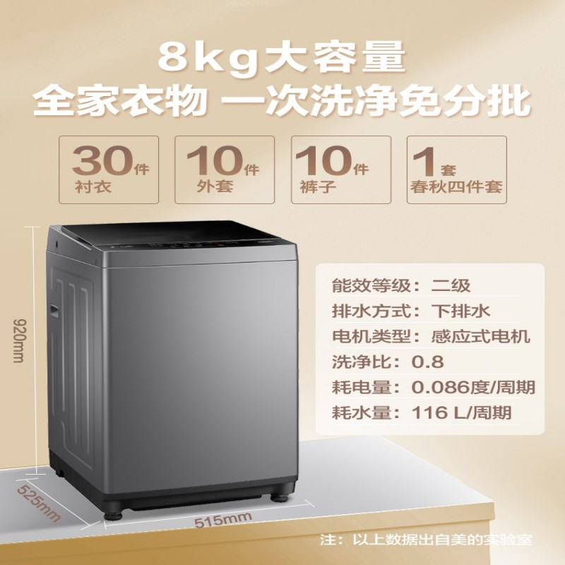 美的洗衣机8kg官方全自动波轮大容量家用脱水租房免清洗 MB80V33B