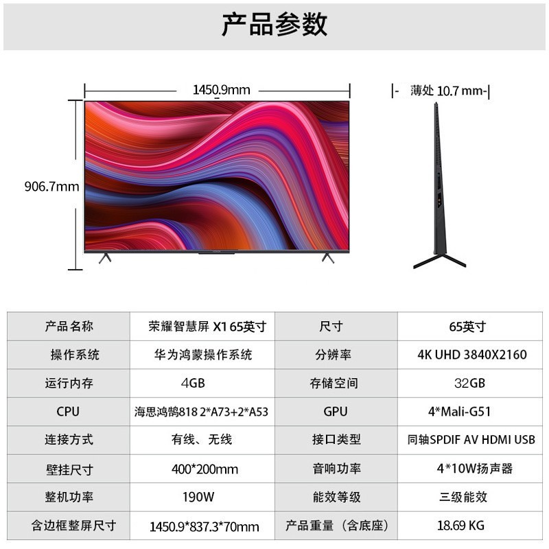 华为荣耀智慧屏X1 65英寸4G版 4K全面屏超高清智能网络电视S55 50
