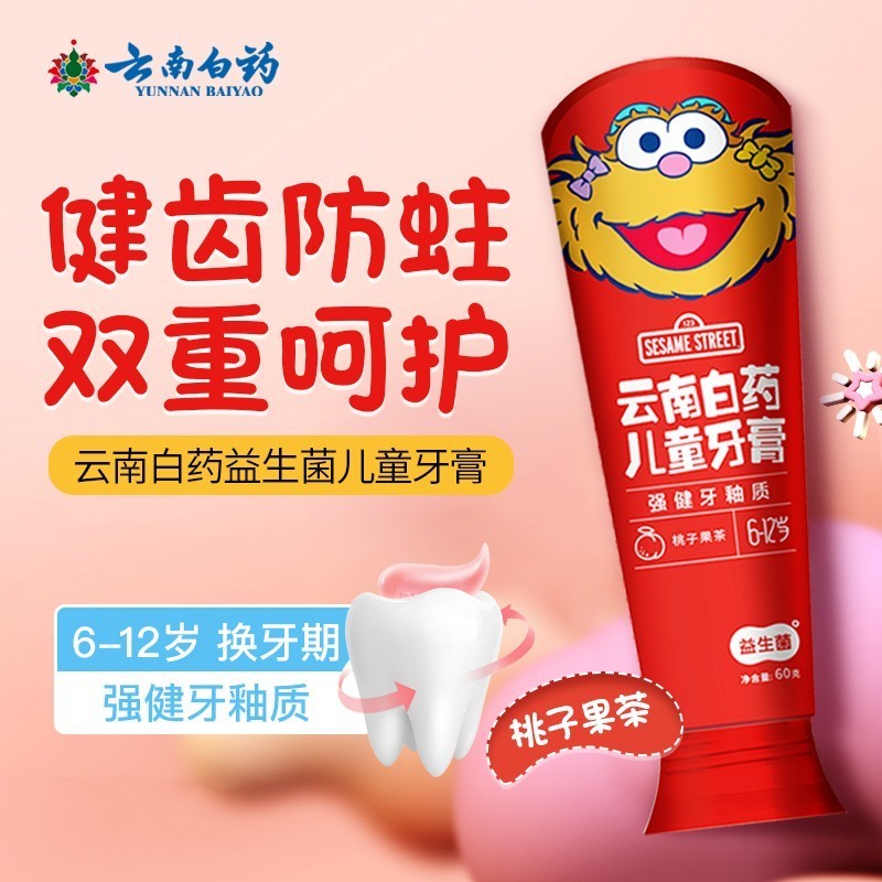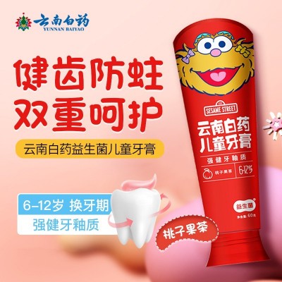 云南白药 儿童牙膏 益生菌儿童牙膏 防蛀固齿强健牙釉质6-12 桃子果味茶 60g